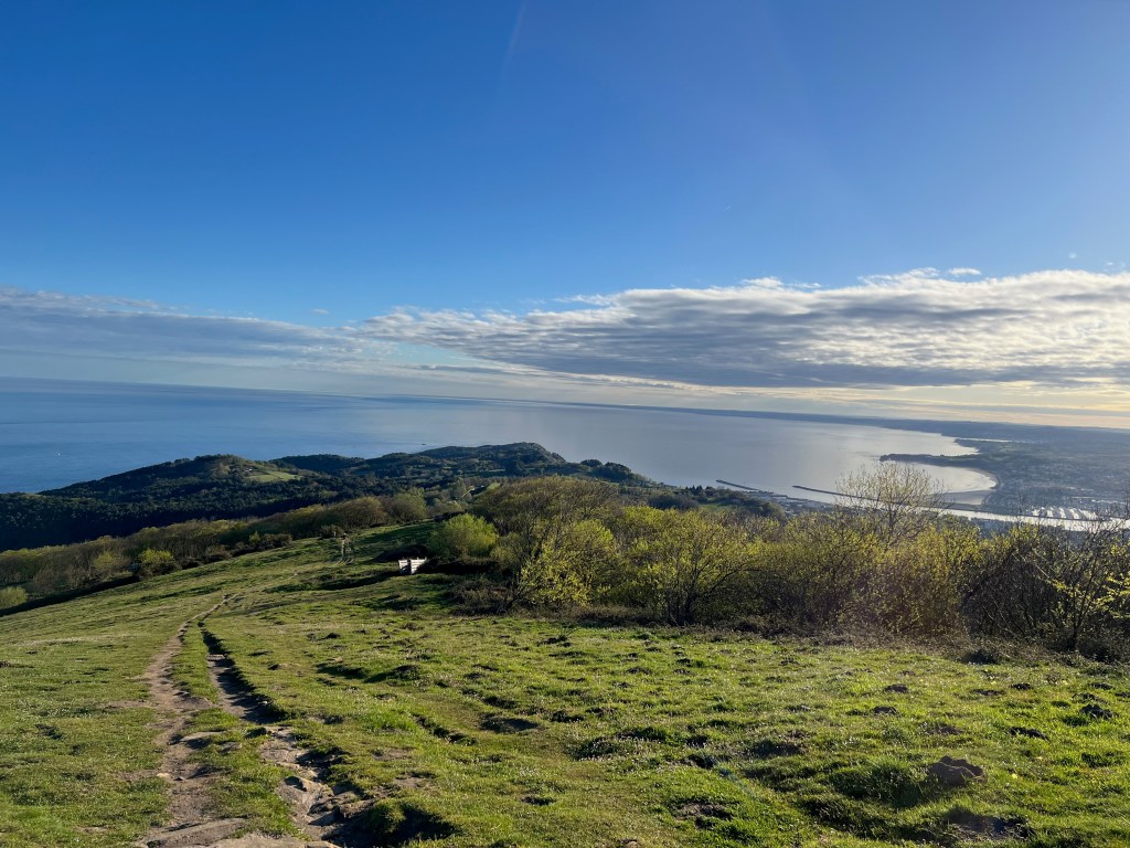 There is a pleasant, flat grassy area with expansive views , to be found about midway .